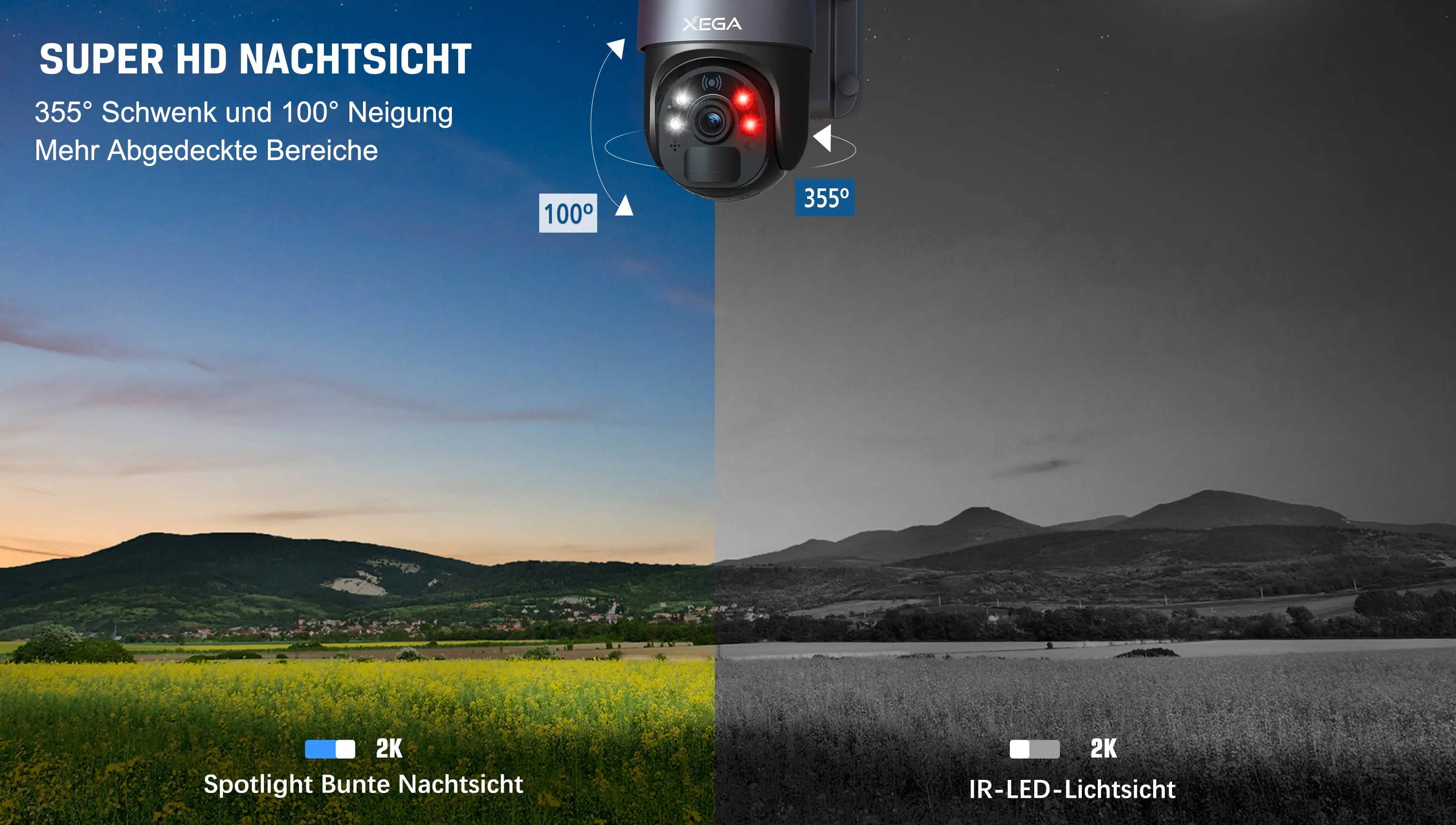 This outdoor security camera features 10 spotlights and two infrared LEDs that illuminate at a 100° angle even in total darkness, up to a distance of 30 meters, presenting you with bright, colorful images picture.